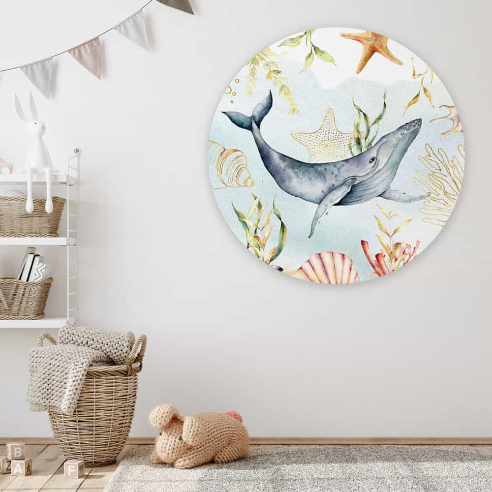 Onze prachtige ronde kunstwerken geven stijl aan elke kinderkamer, babykamer of speelkamer. In een handomdraai tover je de kamer om tot een fijne plek! Muurcirkel ‘Walvis en zeester’ wordt op een licht materiaal geproduceerd, heeft een uitstekende kleurweergave en een lichte structuur. Hierdoor krijgt de wandcirkel een stoere look.